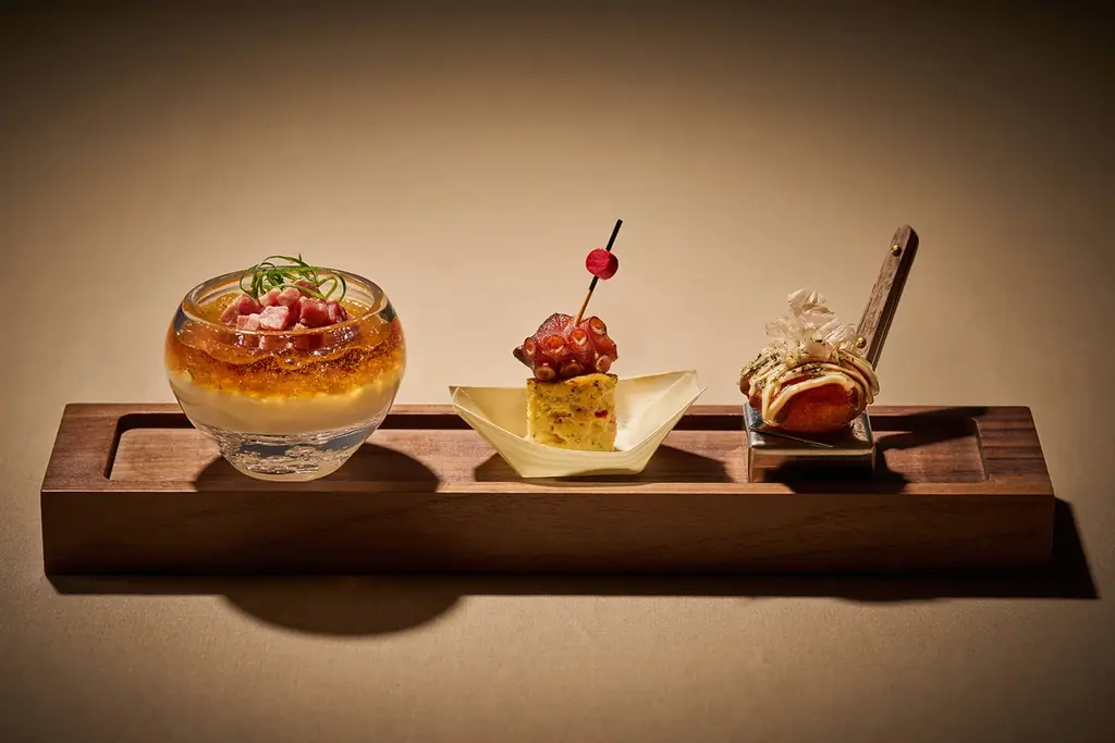 パーク体験後の夜食に適した新メニューとして、17:30~22:00に提供される「大阪満喫プレート」が登場します。内容は、肉吸いを前菜風にアレンジした冷製肉吸い、たこ焼き風トルティージャ、お好み焼き風に仕上げたお好みコロッケの3品構成です。