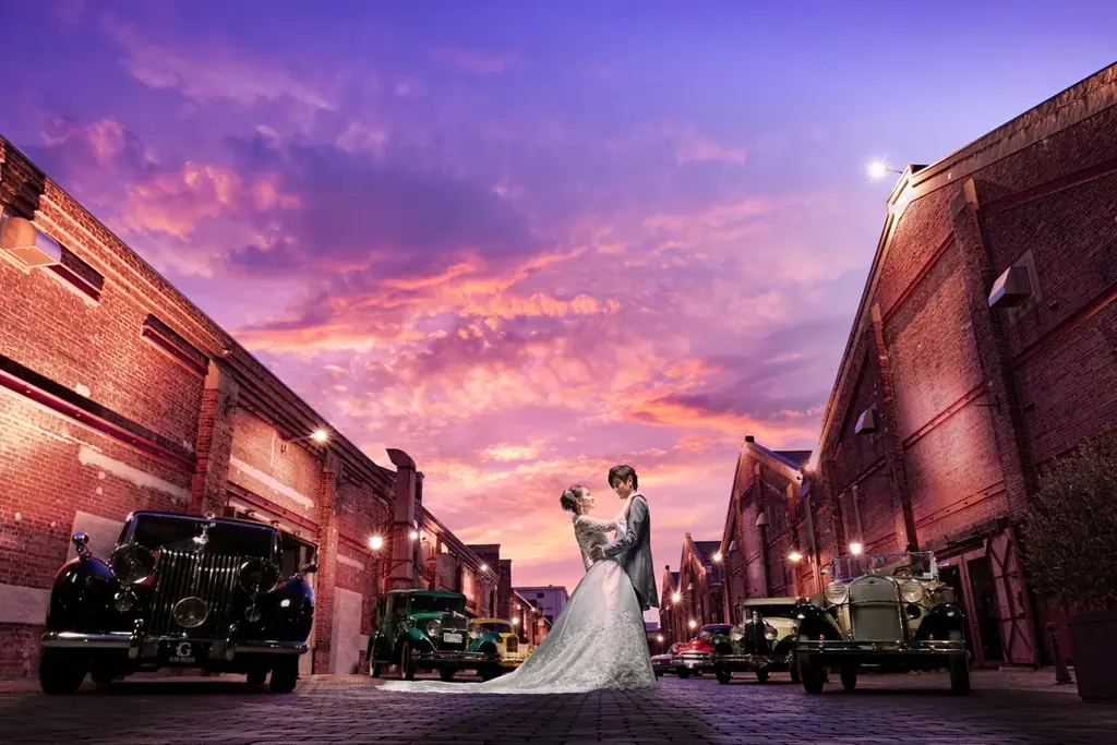 赤レンガ倉庫は約3,000坪の敷地を有し、歴史的な建築素材である赤レンガが生む重厚感と、遮るもののない空の広がりが同居するロケーションが特徴です。1日1組限定のプロデュース体制により、料理・空間・音楽・クラシックカー演出などを融合させたオリジナルウエディングを実現します。