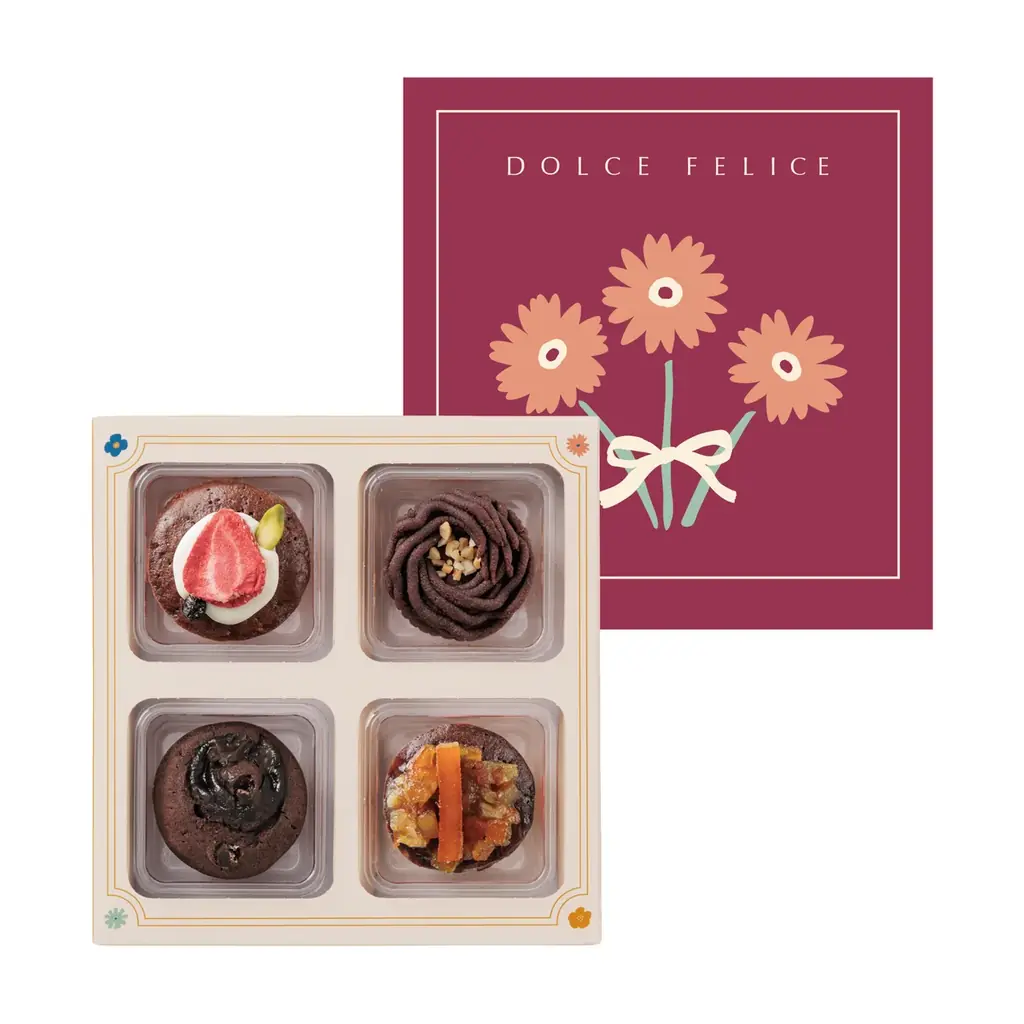 この商品は、〈4種類のチョコレートケーキを詰め合わせたアソート〉として、上品なデザインのパッケージと中身ともにバレンタイン限定仕様で用意されています。大切な相手への贈り物としてだけでなく、自分へのご褒美としても選びやすい構成になっています。