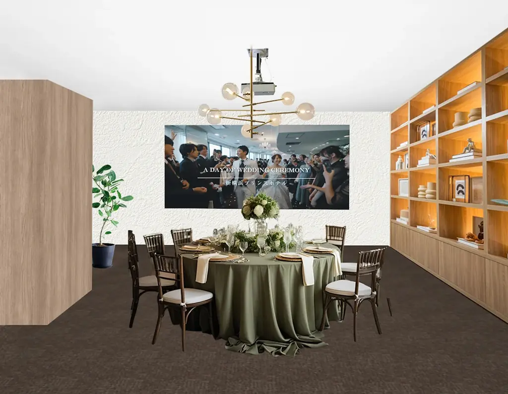 - 150インチの大画面スクリーン:スカイチャペルや披露宴会場の様子を臨場感あるムービーで上映。