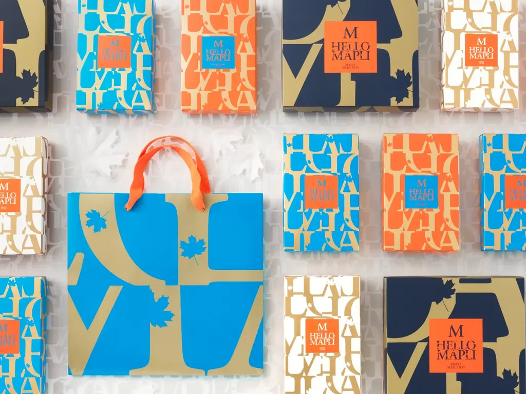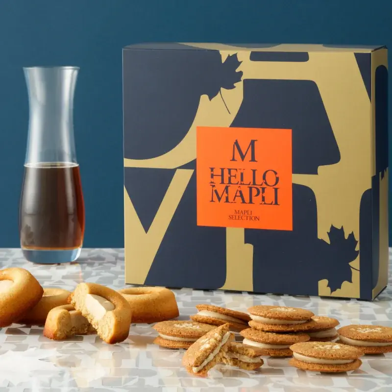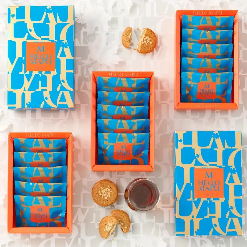 ブランドは従来のメープル菓子にありがちなカントリー調や懐古的なイメージから距離を取り、大胆・モダン・プレミアム感を目指したデザインを採用しました。パッケージは青基調のボックスで視覚的な印象を強め、贈る側の品格や美意識を静かに物語ることを意図しています。