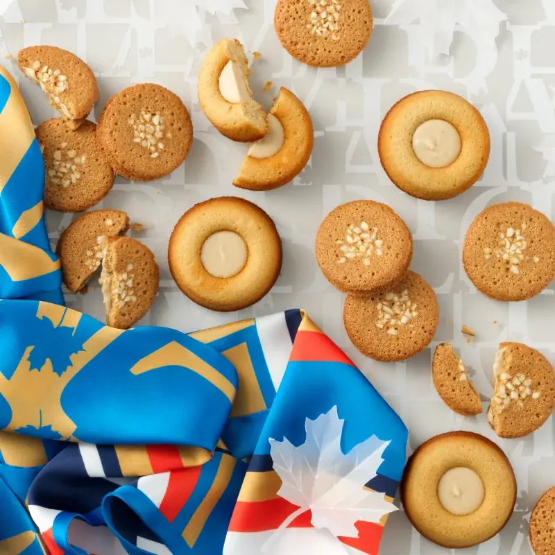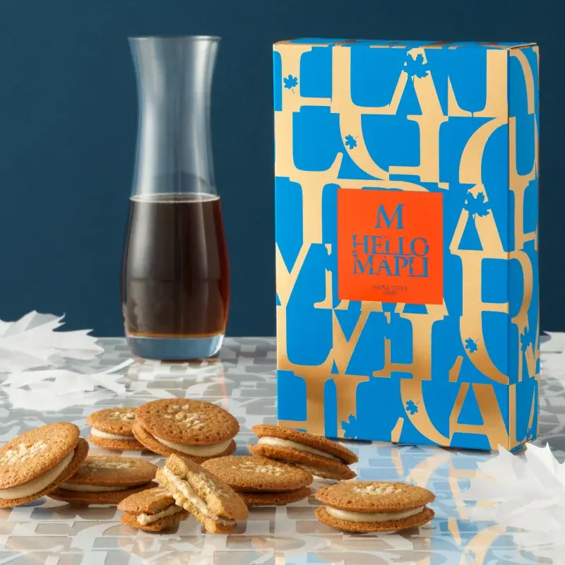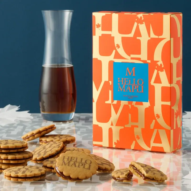 カナダ・ケベック州産のメープルシロップとメープルシュガーを用いて炊き上げた自家製メープルキャラメルを、メープル風味のクッキーでサンドした商品です。キャラメルのまろやかなコクとメープルの余韻が重なります。