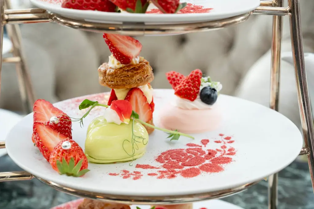 | 主なメニュー(概要) | 1段目:いちごのショートケーキ(あまりん)、レモンゼリーとフランボワーズのグラススイーツ 2段目:いちごのパブロヴァ、いちごのミルフィーユ、ピスタチオムース 3段目:キプフェル、いちごパウンドケーキ、いちごのマカロン、プレーンスコーン 別皿:ツナたまごサンド、オリーブのブロシェット、アンディーブとパルメザンのエスプーマ、自家製スモークサーモンとルビーグレープフルーツのカナッペ |