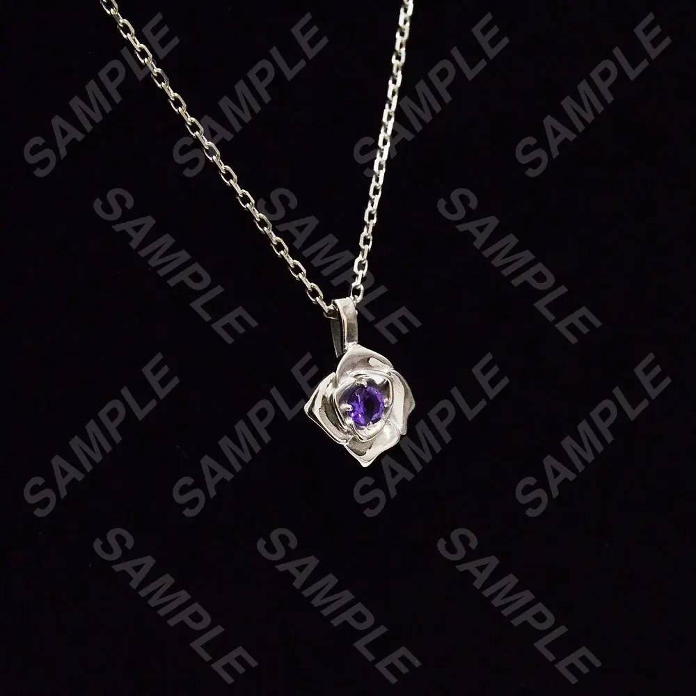 - 『ガラスの仮面』の紫の薔薇をモチーフにしたシルバーネックレス。アメジスト(天然石)を使用。《チェーン長さ:約40cm》。価格:27,500円(税込)