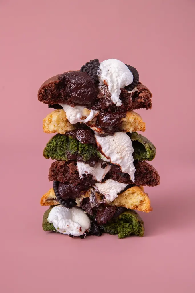 スモアメルトクッキーは、しっとりと焼き上げたクッキーにマシュマロとガナッシュチョコ、ココアクッキーを重ねた構成です。温めることでマシュマロがふわっととろけ、ガナッシュチョコの濃厚さとココア風味が口の中で広がります。プレーン、チョコ、抹茶の3種のボストンクッキーと相性が良く、贈り物や自分へのご褒美に適したラインナップです。