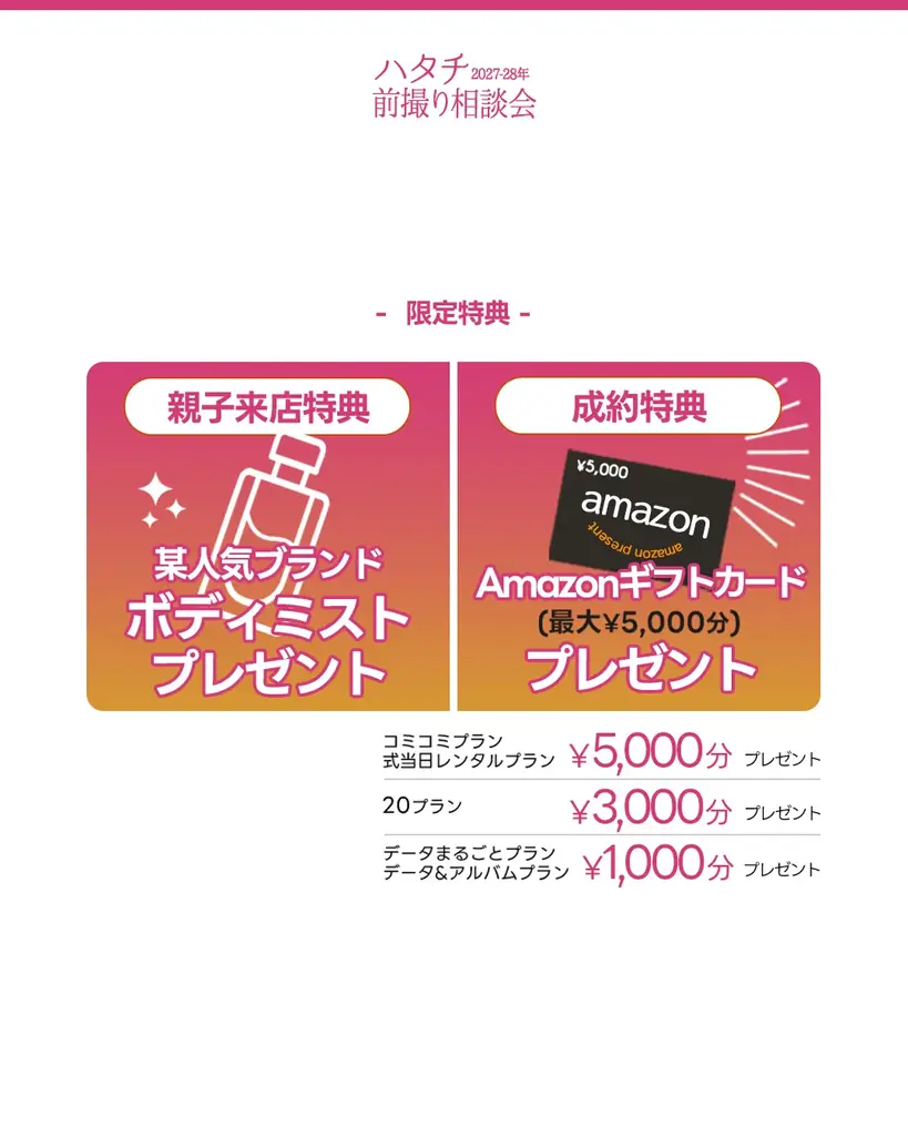 | 主な特典(2月限定) | Amazonギフト最大5,000円、有名カフェ500円券、パパママ着物レンタル&集合写真無料、土日祝撮影料無料、ドレスレンタル無料、髪飾り無料、1dayプランで撮影後おでかけ可、振袖・袴同時契約で最大20%割引など |