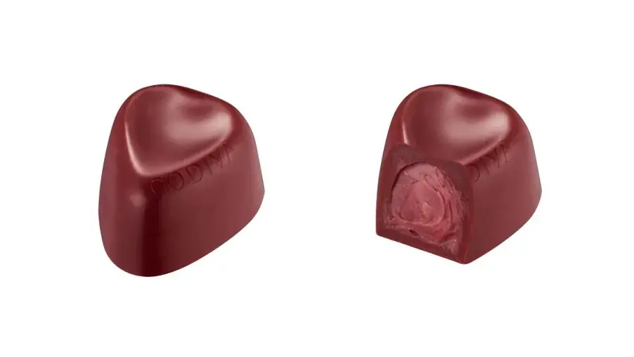 100周年記念でリニューアルされたゴディバのシンボル、ハート形の「クール」。丸みを帯びたバーガンディーカラーのホワイトチョコレートシェルに、爽やかな酸味のラズベリーガナッシュを閉じ込めています。