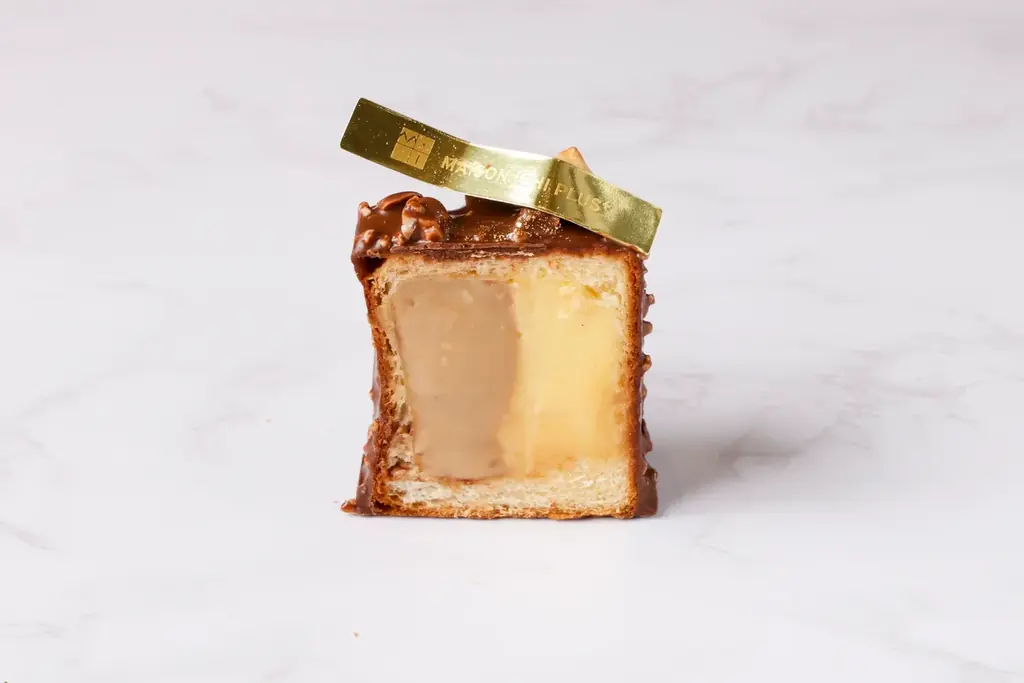 見た目はドーナツに似ていますが、ベースは焼いたブリオッシュ生地。リング状に焼き上げた生地の中に、カスタードクリームと生キャラメルクリームを閉じ込めています。食感はブリオッシュの軽さを残しつつ、内部からとろりとしたクリームが溢れるタイプです。