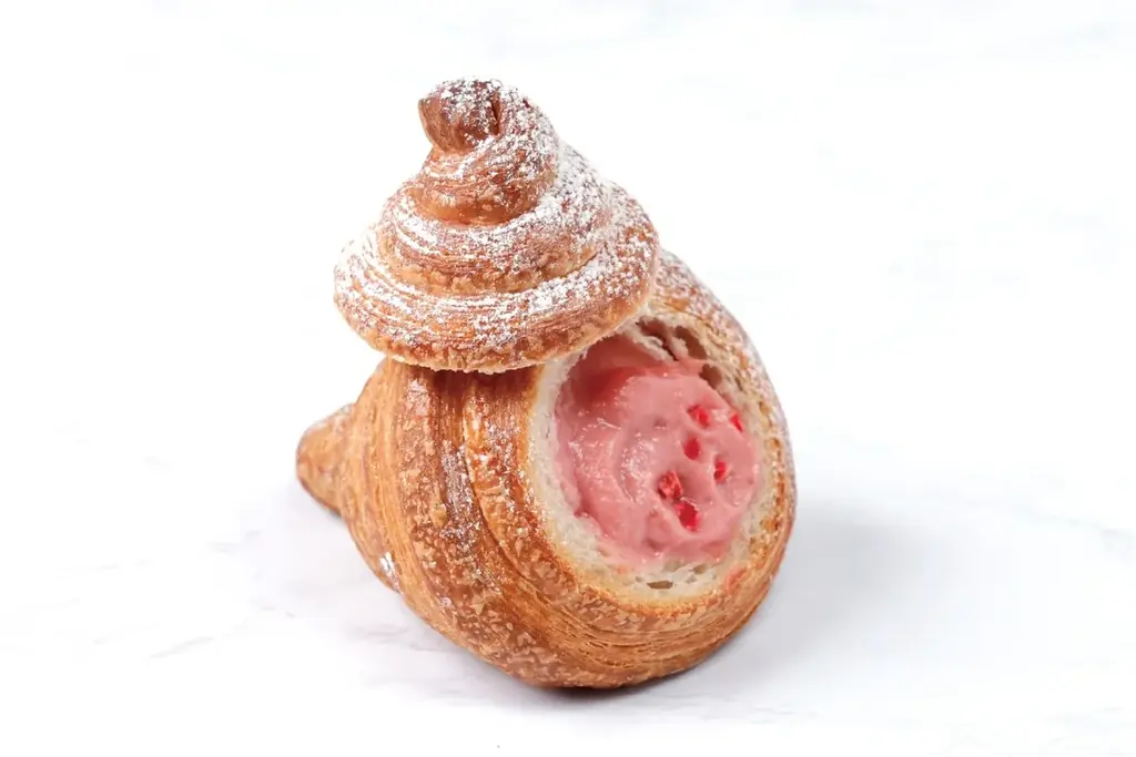 - あまおう苺のストロベリーコルネ:発酵バターを贅沢に使用したサクサクのクロワッサン生地に特製の苺クリームを絞り込んだ一品。旬のあまおう苺が主役です。テイクアウト:497円 / イートイン:506円