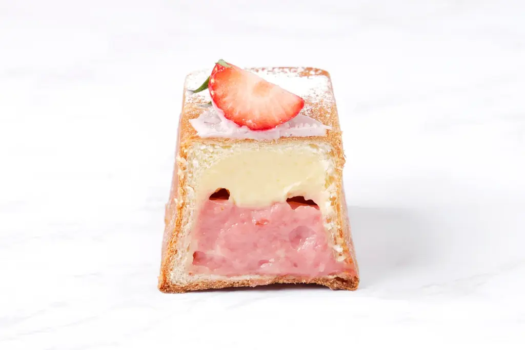 - あまおう苺のクリームパン:四角いパンの中に自家製カスタードクリームと苺クリームの2層構造を閉じ込めた、苺を活かしたクリームパンです。テイクアウト:518円 / イートイン:528円
