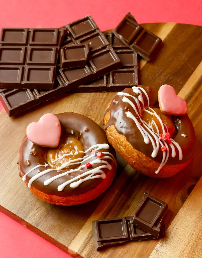 | 塩キャラメルクリームパン | ブリオッシュ生地をリング状に焼き、カスタードと生キャラメルクリームを封入。表面はビターチョコディップ、ピンクのハート形クッキー添え。 | – | – |