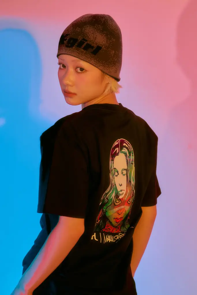 マーク・ボーデは、ヴォーン・ボーデの息子として生まれ、アンダーグラウンド・コミックの流れを継承しつつ、グラフィティや壁画、タトゥーなど多岐にわたる表現活動で知られています。今回のグラフィックは、彼の持つ反骨精神やカウンターカルチャー的ユーモアをX-girlのストリートウェアに適合させる形で再構築されています。