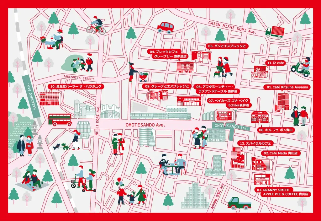 プレスリリースに記載された参加店舗一覧は次の通りです:Café Kitsuné Aoyama、Café Madu 青山店、GRANNY SMITH APPLE PIE & COFFEE 青山店、ブレッツカフェ クレープリー 表参道店、パンとエスプレッソと、アフタヌーンティー・ラブアンドテーブル 表参道、ベイカーズ ゴナ ベイク Echika表参道、キル フェ ボン青山、クレープとエスプレッソと、資生堂パーラー ザ・ハラジュク、i2 cafe、スパイラルカフェ。