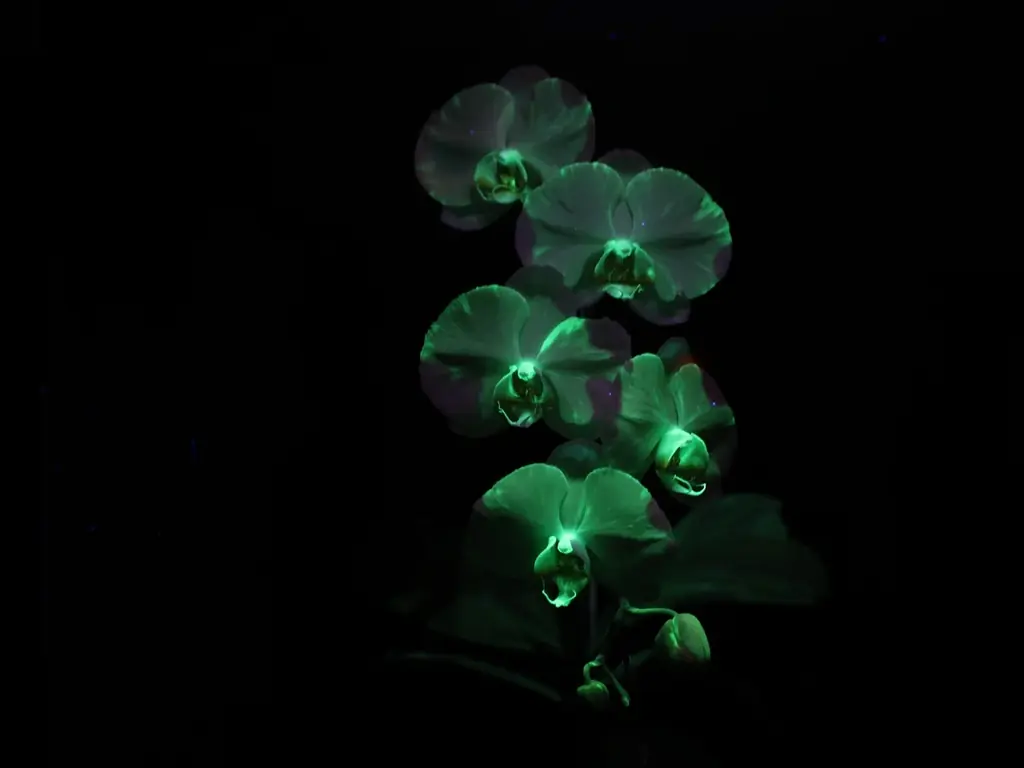 光るコチョウラン:千葉大学、NECソリューションイノベータ、奈良先端科学技術大学院大学の共同開発による「光るコチョウラン」は、暗室でブラックライト照射下に黄緑色に光る世界に1株のみの貴重な個体です。2024年に初公開され話題となり、本展で再展示されます。撮影は暗室・紫外光下での表現となります。