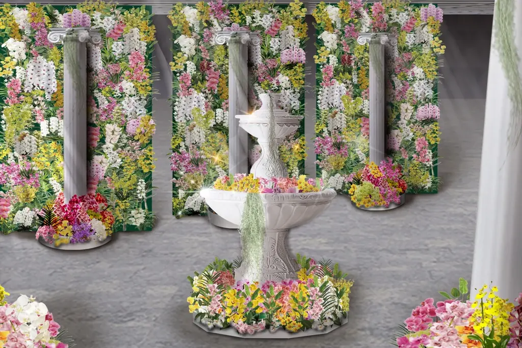 本展は今回で36回目の開催となり、会場には1,000種以上、100万輪もの蘭が展示されます。展示は単なる鉢植えの集積ではなく、主催者による演出を含めた「蘭と神殿が織りなす世界観」を体現する構成が用意されています。