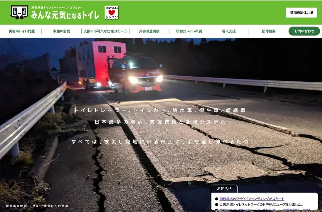 災害派遣トイレネットワーク「みんな元気になるトイレ」を運営する一般社団法人助けあいジャパンは、2026年1月末時点のネットワーク参加状況とクラウドファンディング開始の情報を2026年2月5日 01時58分に公開しました。公式情報は https://tasukeaijapan.jp/toilet/ に掲載されています。
