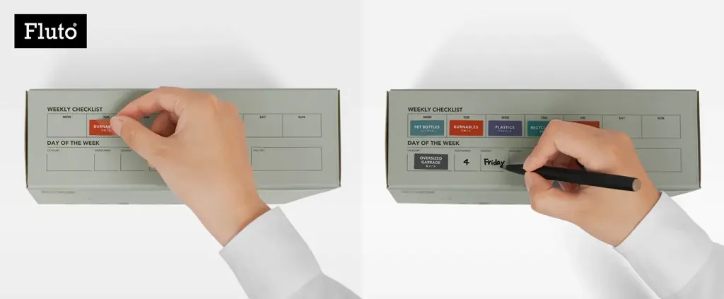 分別カレンダーはパッケージの表面に配置できる週間スケジュール表として機能します。家庭ごとの回収日や分別のルールを書き込むことで、キッチンや玄関などゴミを置く場所から直接確認できるようになります。