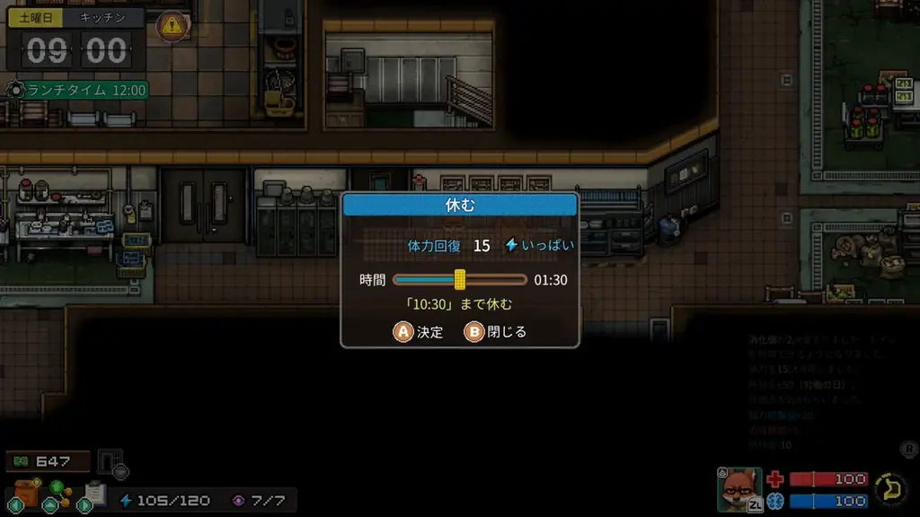 - 時間経過で減少し、空腹状態が続くと健康値と心境値が下がり続ける。食事や刑務所内の行動で補う必要がある。