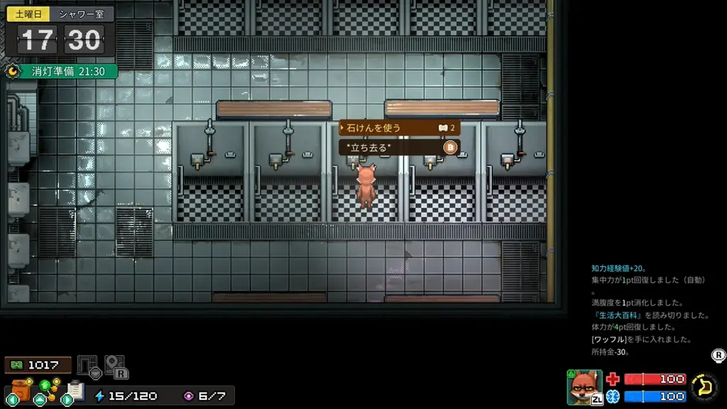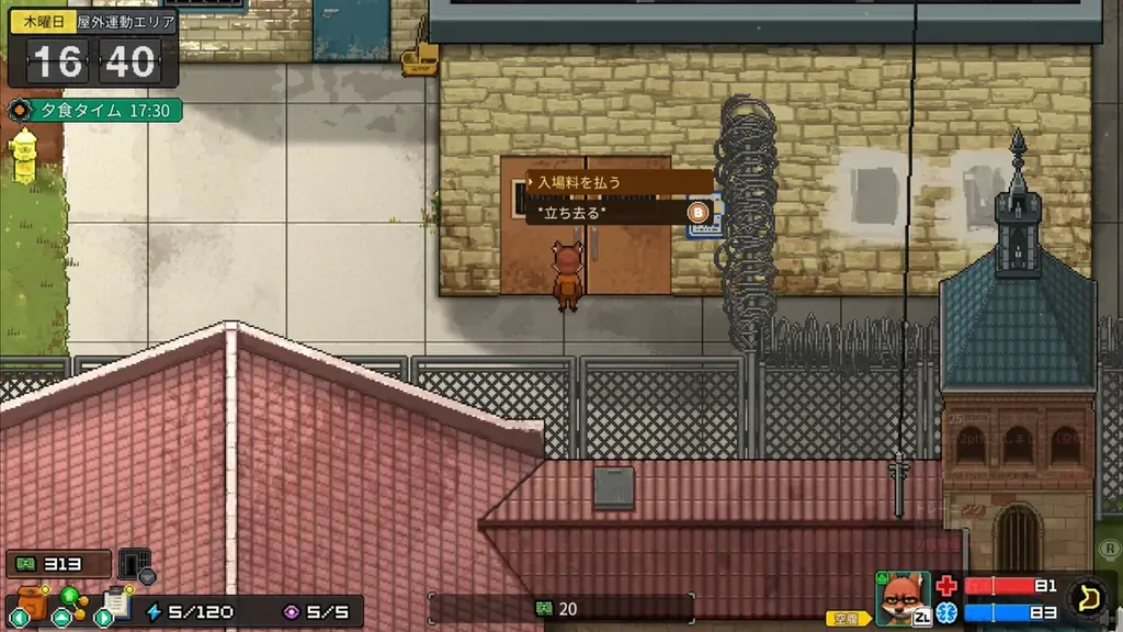 - 食事: ランチタイムには無料でコッペパンが提供される。追加料金でメニューを豪華に変更でき、メニューにより得られる効果が異なる。夕食のワッフルは18時までは無料で、料金を払えばホイップを追加可能。他の囚人と隣に座ることで食べ物をせびったり分け合うことも可能。