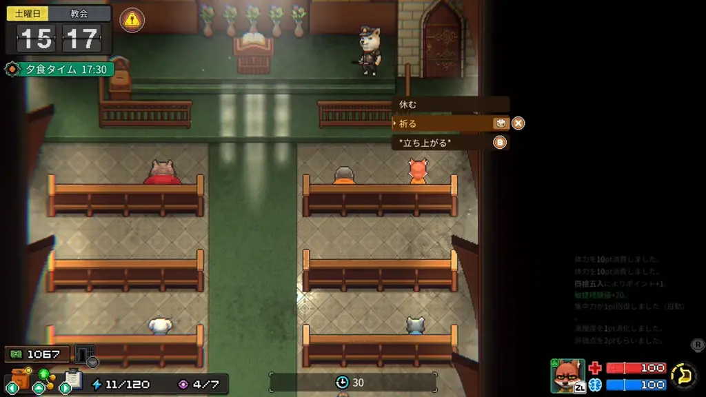 - 仕事やトレーニング、アイテム探索など多くの行動に必要。ゼロになると行動不能。イスで休む、睡眠、アイテムで回復可能。