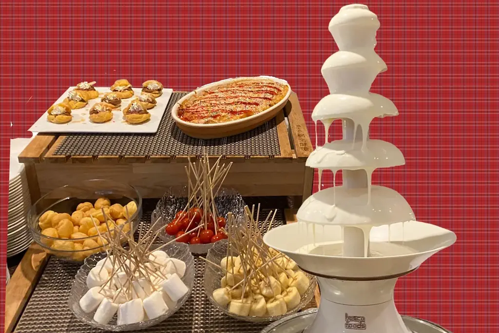 フォンデュはビュッフェの一角に設けられ、参加者は自由に取り分けて楽しめます。マシュマロやミニシュー、カットフルーツが用意され、ホワイトチョコレートと合わせることで見た目と味の両面で季節感を演出します。