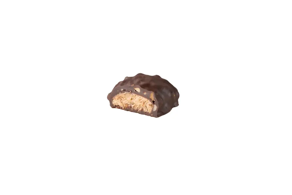 クリーミーなピーカンナッツプラリネをやさしい甘さのミルクチョコレートで包んでおり、カリッとした食感のほろ苦いカカオニブをトッピングしています。最後にミルクチョコレートで重ね包みしています。