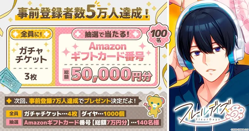 事前登録の進捗については、既に事前登録者数5万人達成に伴い、サービス開始時に《ガチャチケット3枚》が追加で付与されることが確定しています。さらに事前登録7万人到達で、報酬は《ガチャチケット計10枚》と《無償ダイヤ1,000個》に加え、抽選で140名に総額7万円分のAmazonギフトカード番号が当たるキャンペーンが実施されます。