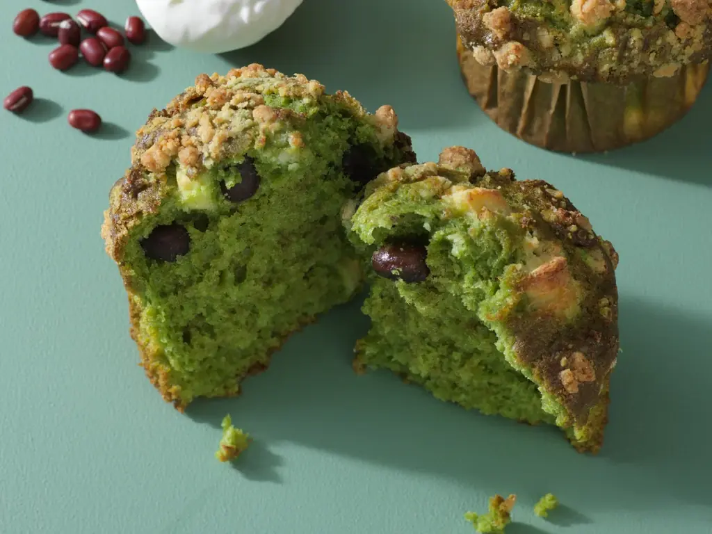 - 狭山抹茶とあずき豆乳クリームマフィン(BAGEL&BAGEL my style plus エキュート大宮):1個 383円。狭山抹茶練り込み生地に粒あんと豆乳クリームを合わせています。