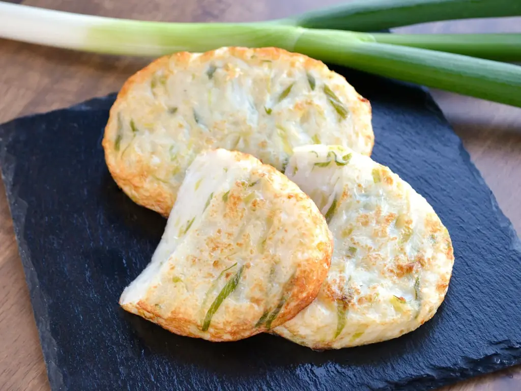 - 深谷ねぎ天(てとて エキュート大宮):1点 420円。深谷ねぎを主役に玉ねぎを加えた揚げかまぼこ。数量限定:1日20点。