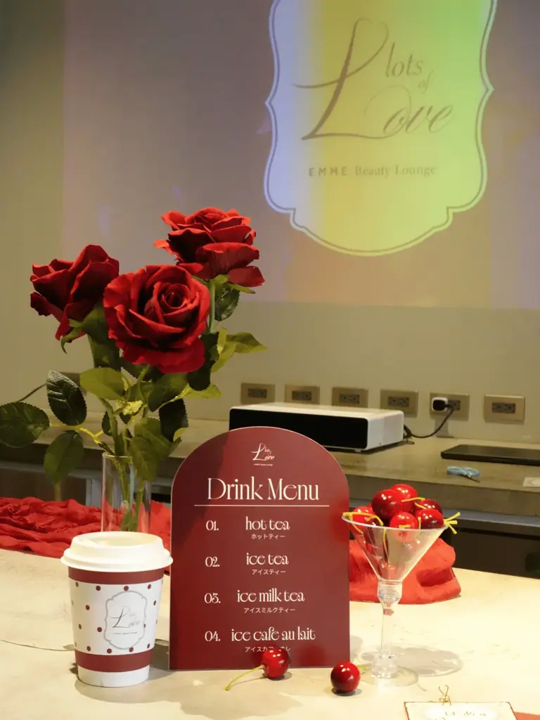 ケータリングはバレンタインイメージを反映した華やかな内容で、飲食ブースにはオリジナルドリンクが4種類用意され、来場者は視覚と味覚でもイベントテーマを体感できる構成でした。