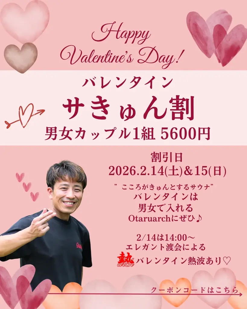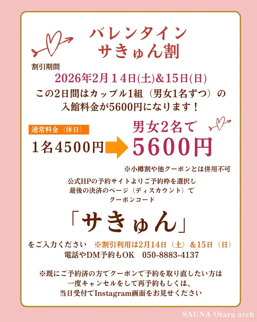 | バレンタイン割(サきゅん) | 期間:2026年2月14日・15日。クーポン「サきゅん」を入力でカップル利用 9,000円→5,600円。2月14日14時に熱波師エレガント渡会による熱波イベントあり。併用不可。 |