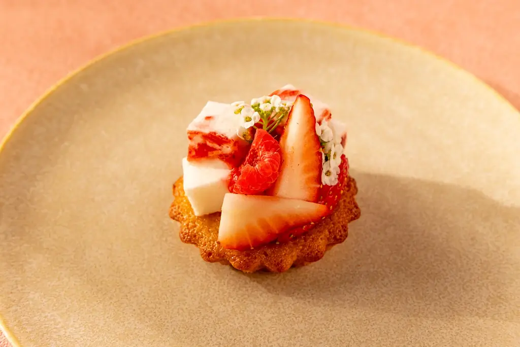 桜風味のしっとりとしたフィナンシェを土台に、季節のフルーツ(ライチ、苺)を合わせたふんわりしたジュレをのせたタルトレットです。フィナンシェのコクと果実の酸味が組合わさり、春らしい軽やかな味わいになります。