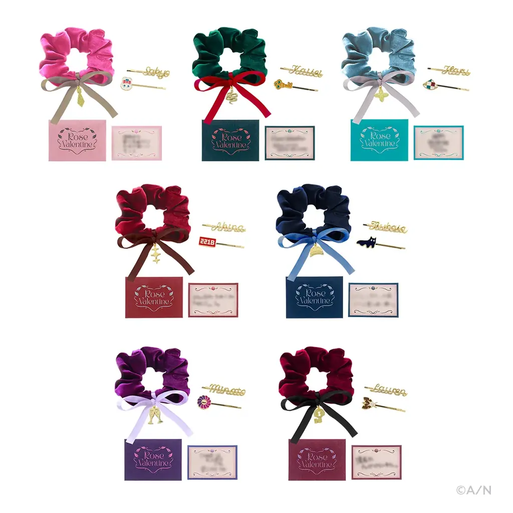 種類:全7種/サイズ(約):シュシュ W100mm×H100mm、ヘアピン W63mm×H17mm以内、メッセージカード W95mm×H70mm/素材:ポリエステル、亜鉛合金、紙