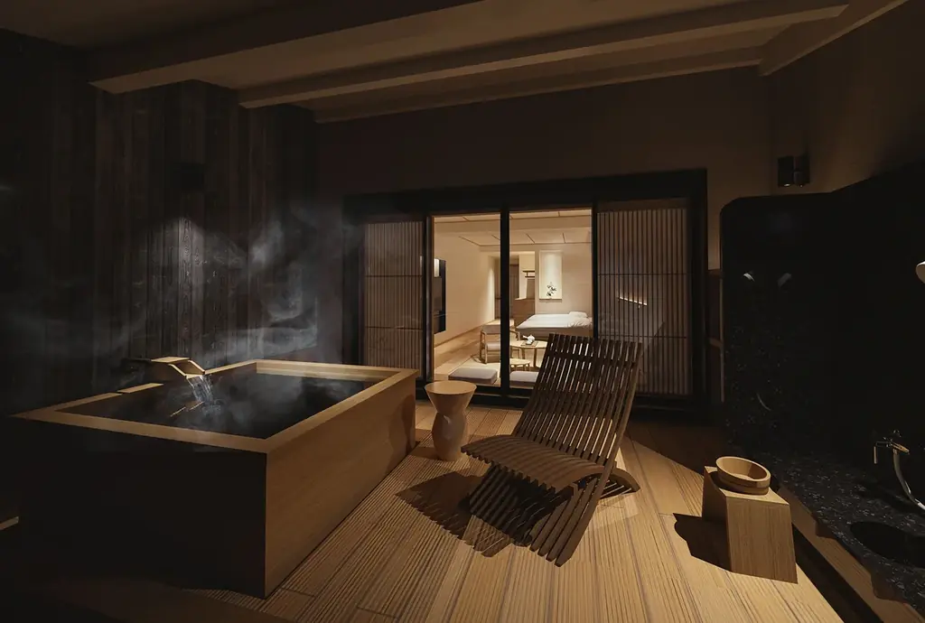 YOKI MATSUSHIMAは全26室に絞ったラグジュアリーな滞在と、和モダンの調和を図った内装を特徴とします。全室がオーシャンビューで太古天泉松島温泉を引いた温泉付き。露天風呂付客室が9室、半露天風呂付客室が17室で構成され、客室面積は41~69平米と広めの設計です。