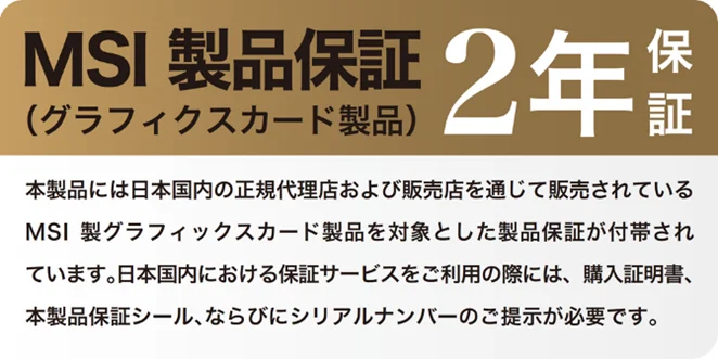 MSIは同社製グラフィックスカードの保証期間について、GeForce RTX™ 50シリーズ搭載モデルから保証期間を延長し、<strong>2年間</strong>の保証を提供することを明記しています。ただし対象は正規代理店の製品保証シールが貼られた新品グラフィックスカードに限定されます。購入時のパッケージ表記と保証シールの有無を確認することが重要です。
