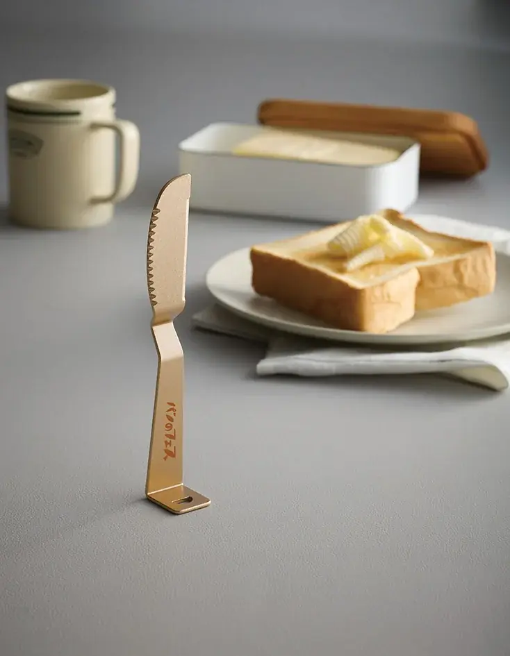オリジナルバターナイフはパンのフェスロゴ入りの特製デザインで、熱伝導性によりバターを溶かしやすく、滑らかに切ったり塗ったりすることができます。横置きにした際に先端がテーブル面に触れない設計で、立てて置ける機能も備えています。素材はアルミニウム、本体全長は150mm、箱サイズは185×54×30mmです。