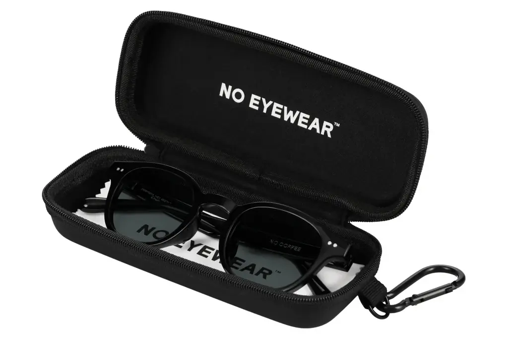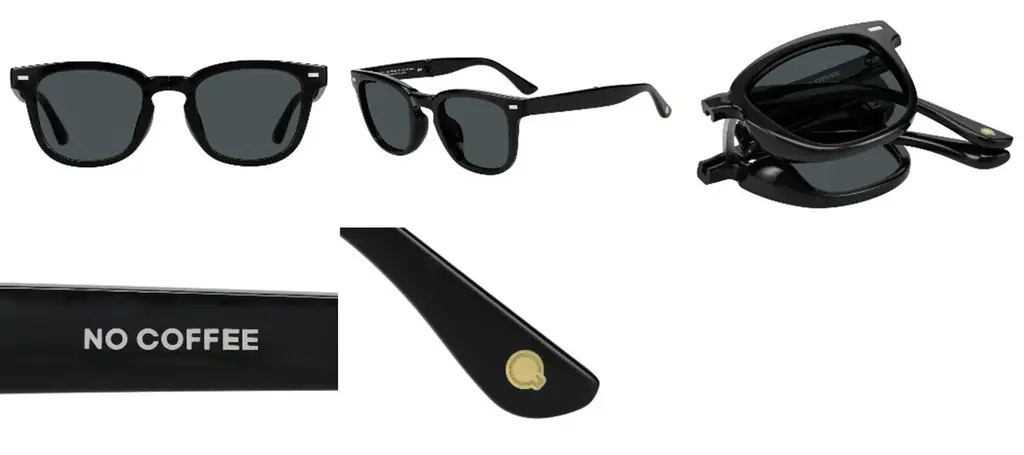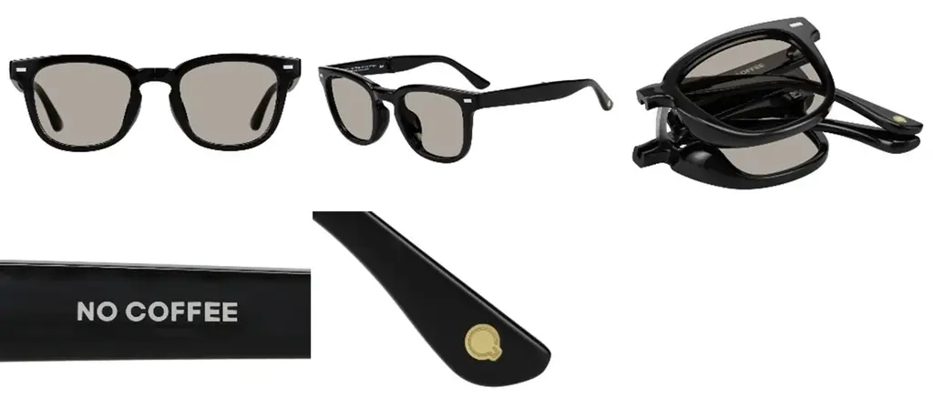 また、マークは上から見たマグカップを想起させるモチーフを使用。テンプル内側にはさりげなくロゴが入っており、折りたたみサングラスは折りたたんだ際にNO COFFEEのロゴが現れる仕様です。こうしたディテールにより、日常使いの定番としての佇まいとブランドのアイデンティティを両立させています。