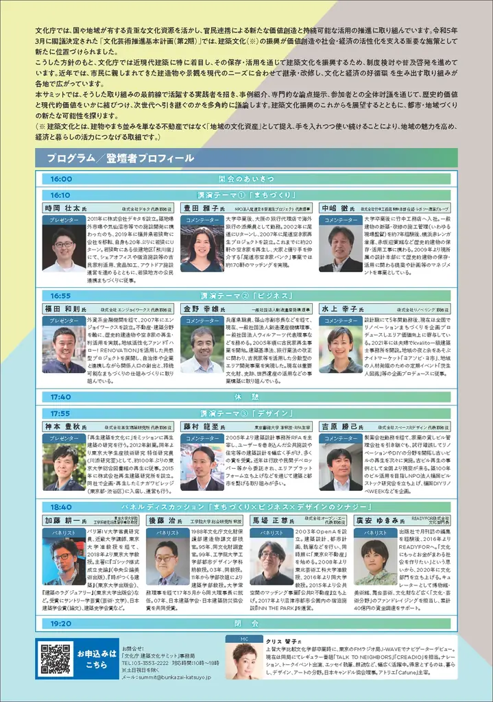 以上が今回のプレスリリースに記載された全項目の整理です。建築文化をめぐる保存と活用の実務的な議論や、まちづくりとビジネス、デザインの接点を明確にする場として企画されたことが確認できます。