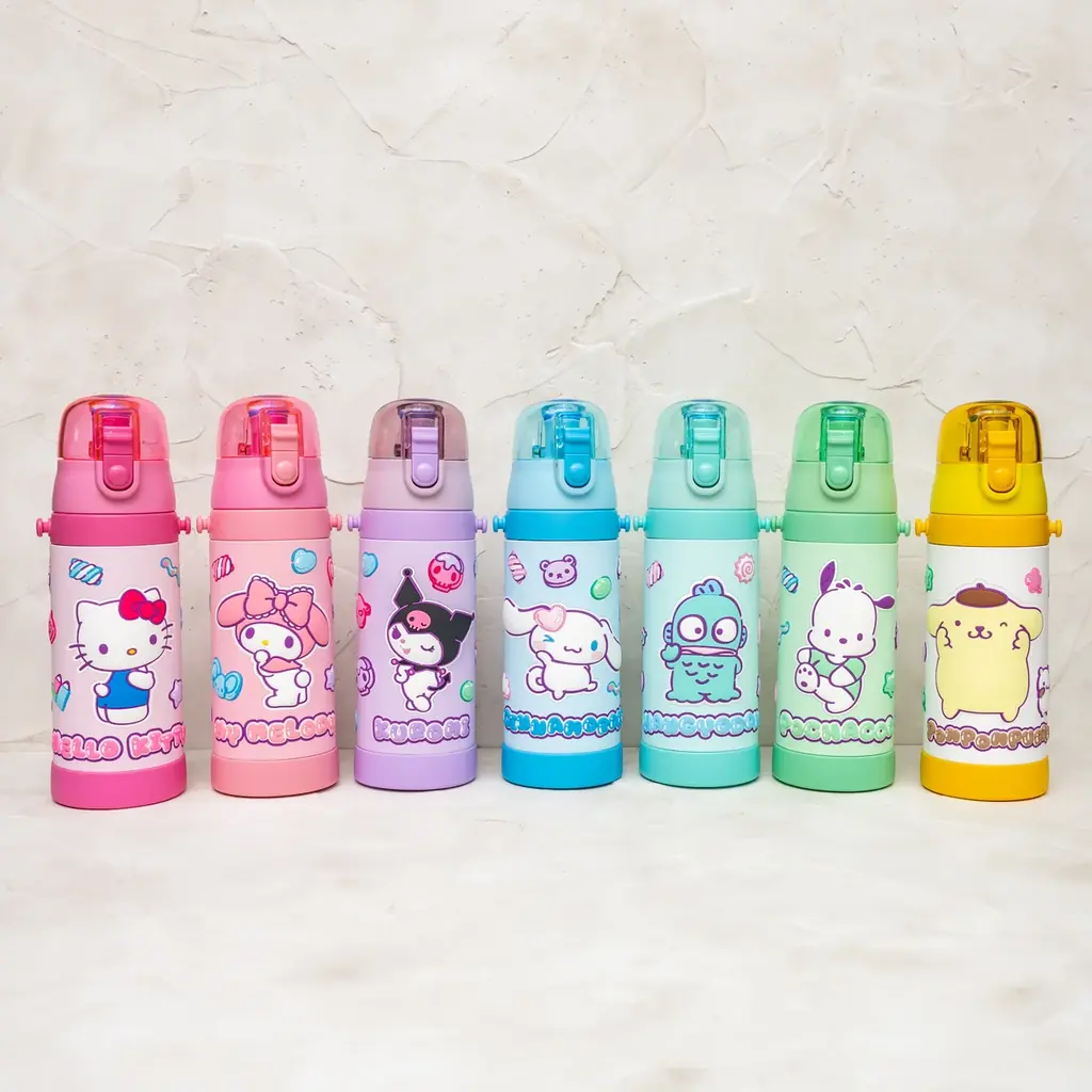 本シリーズはサンリオの人気キャラクター全7種で展開され、それぞれのキャラクターに合わせたカラーリングで用意されています。製品は容量480mlで日常使いに適したサイズです。