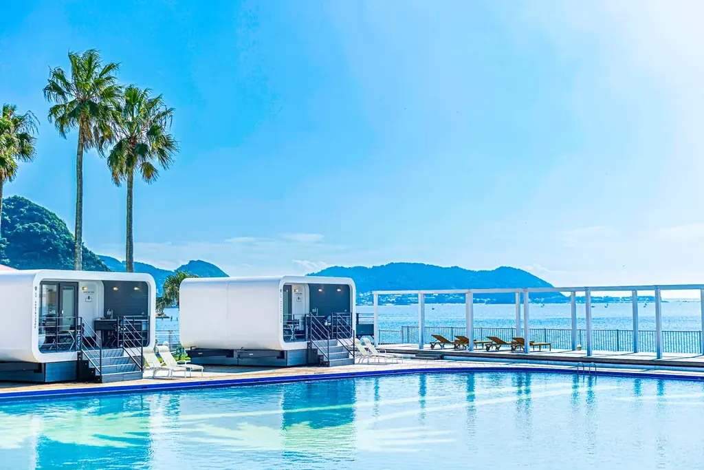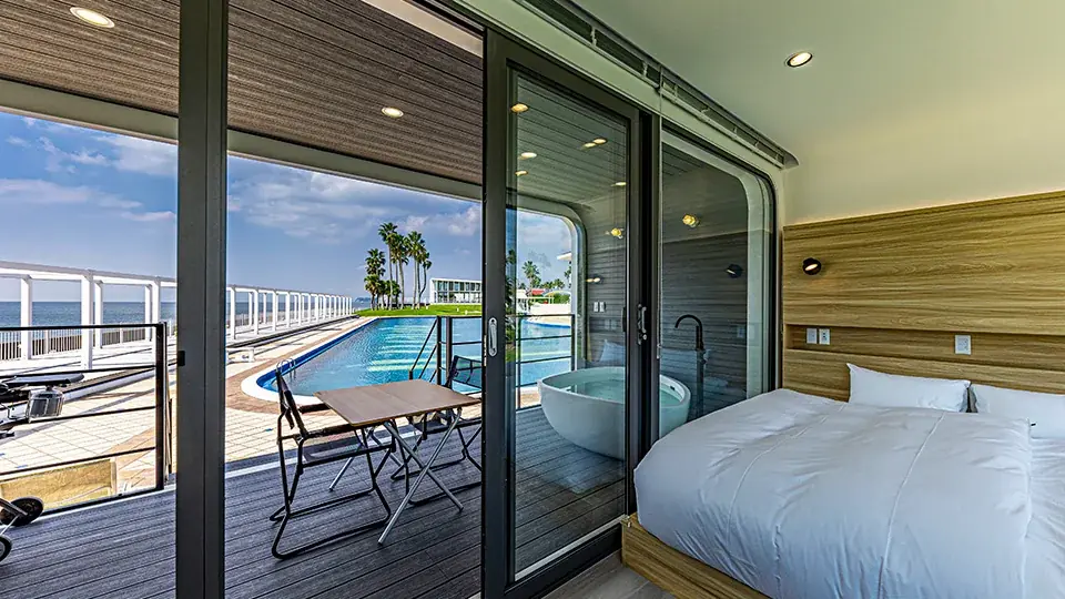 スペースキーポイントは2022年7月7日にオープンしたトレーラーホテルで、コンセプトは「自然と同期する」。前面をガラスにした客室は全棟オーシャンビューで、プライベートテラスにバーデプールやBBQセットを備え、ドッグフレンドリールームも用意されます。宿泊者専用のセルフロウリュ可能なサウナも設けられ、海を眺めながら“ととのう”時間を提供します。