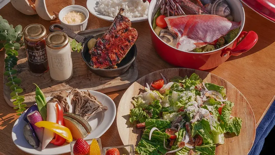 神奈川県産やまゆりポークの骨付きスペアリブをはじめ、伊勢海老、金目鯛、蛤などの魚介を用いたブイヤベースを中心に、地産地消の食材で構成されるメニューです。BBQはスタッフが準備・後片付けを行うため手ぶらで利用できます。