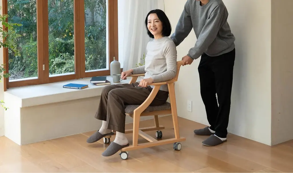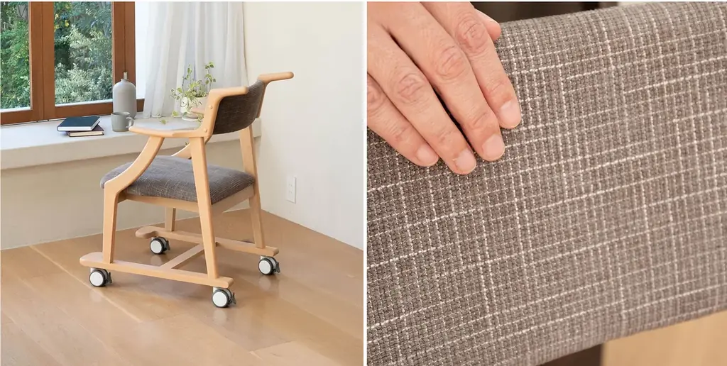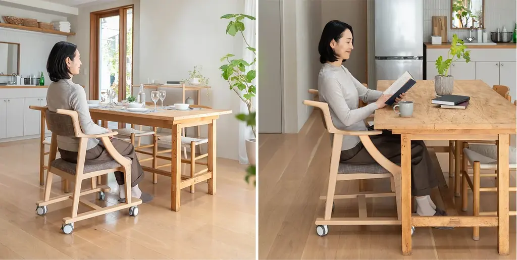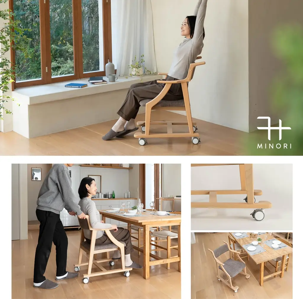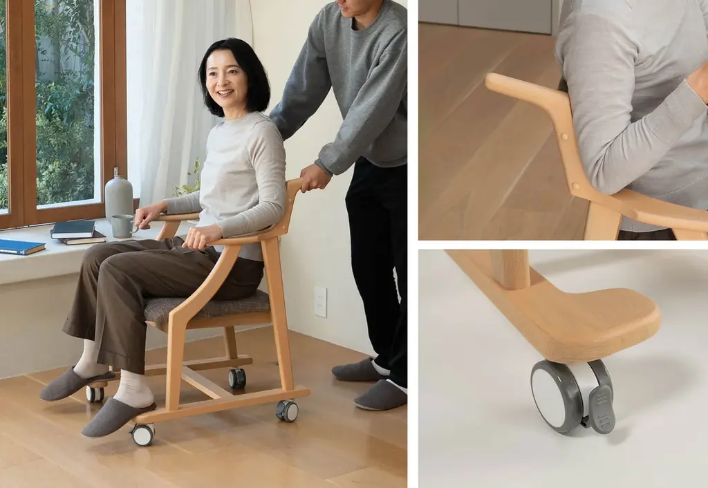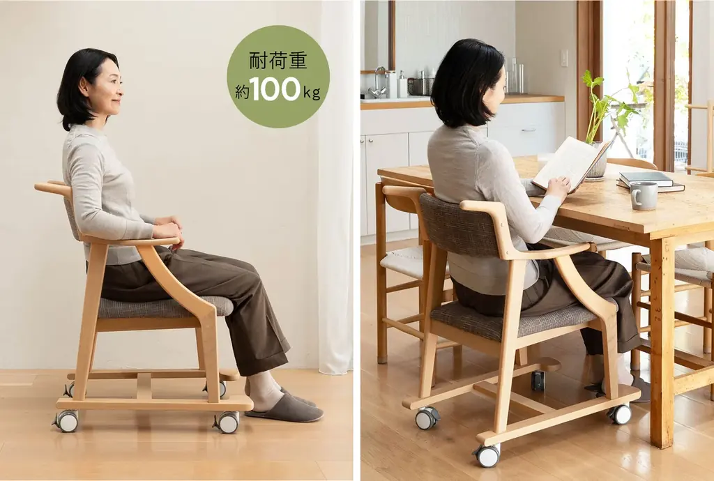 こうした機能により、日常のダイニングチェアとしての使用だけでなく、介護シーンやサポートが必要な場面にも対応できる設計になっています。デザイン面でもインテリアに馴染むことを重視しており、ニレ無垢材の美しい木目と落ち着いた色調が特徴です。