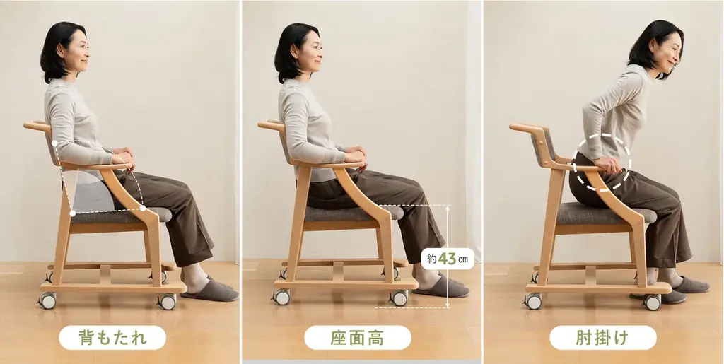 みのりシリーズは「食事のしやすさ」と「食後のひと休み」を両立することを目的に人間工学に基づいて設計されています。座るときの姿勢を安定させ、食事中に前かがみになりにくく、休息時には胸まわりまでやさしく支える構造により、「食べる時間」と「くつろぐ時間」を自然に切り替えられる点が設計の核です。