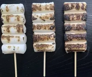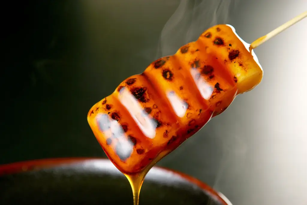 喜八洲総本舗は、注文を受けてから直火で炙るみたらし団子の提供をイートインで行います。団子は餅粉と米粉を絶妙に配合して蒸し上げ、俵型(円筒に近い形)で提供することでタレがよく絡み、強い直火で香ばしい焼き目をつけます。