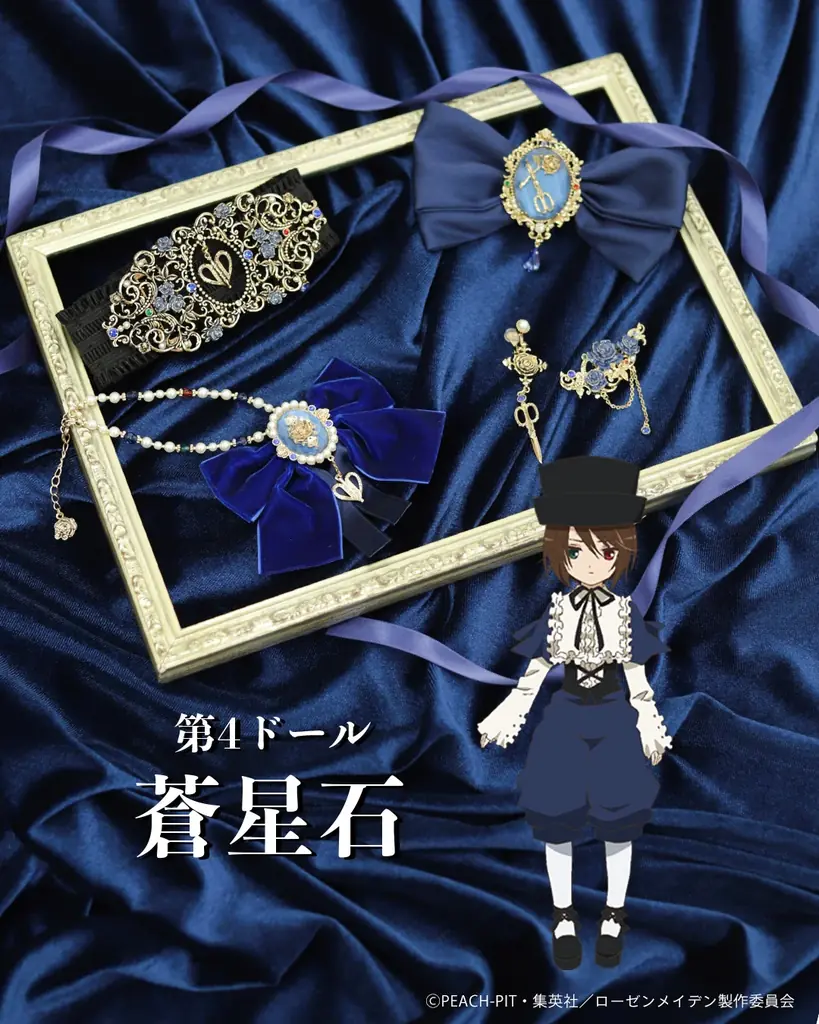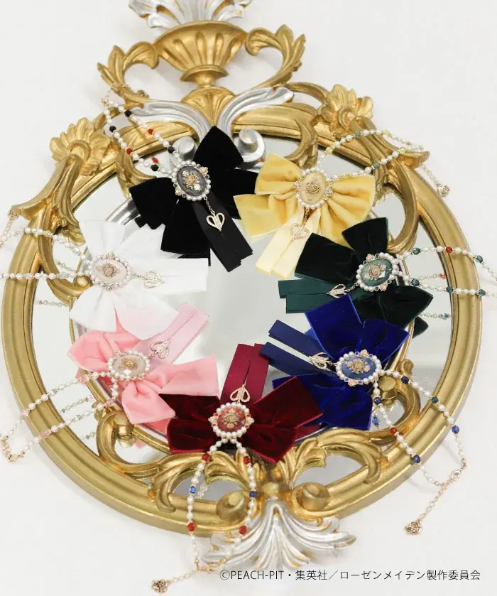 コラボレーション全体のデザインコンセプトは、ローゼンメイデンの持つ〈薔薇〉や〈人形(ドール)〉という象徴をaxes femmeのクラシカルな美意識で翻訳することにあります。各アイテムには「ドールズの薔薇の色」と「瞳の色」をストーン等で表現し、細部にはアンティーク調のメッキ、パール、ラメ、樹脂パーツなど多様な素材を用いて上品な装飾性を持たせています。