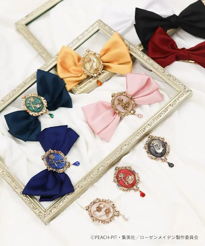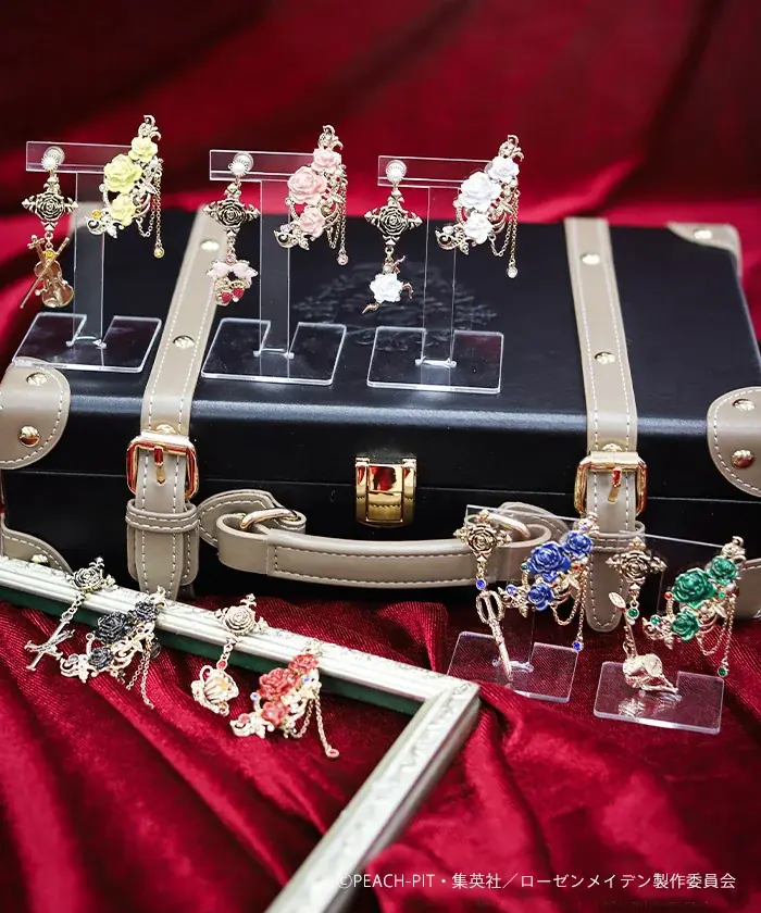 本コラボでは4種のアクセサリーが展開されます。以下に品名、価格(いずれも税込)、品番、カラー展開、主な仕様を具体的に記載します。すべてのアイテムは〈ドールズの薔薇の色〉に準じたカラー展開がなされており、作品内での各ドール(第1~第7)をイメージした色づかいとモチーフ配置が共通のデザイン方針です。