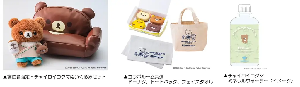 | 宿泊特典 | チャイロイコグマぬいぐるみセット(1室1セット+追加購入可)、オリジナルトートバッグ(1室2枚)、ウェルカムドーナツ(4個)、ミネラルウォーター、フェイスタオル、客室内有料カプセルトイ(1回500円) |