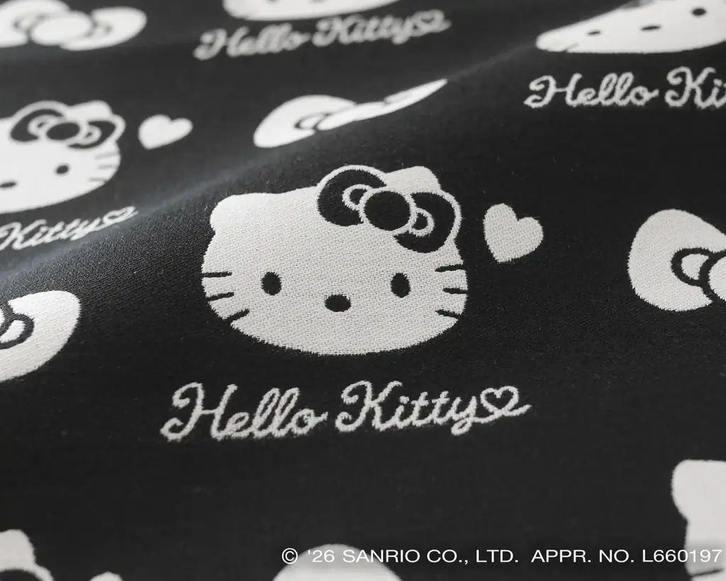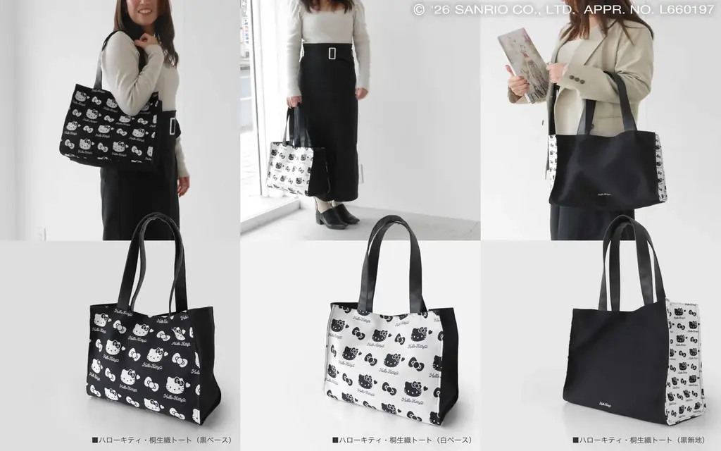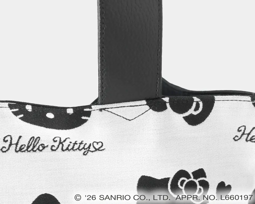 「ハローキティ・桐生織トート」は、桐生織ならではの先染め紋織の表現力を活かし、モノトーン基調のデザインで甘さを抑えた大人向けの表情に仕上げられています。プリントでは得られない立体感と素材感が特徴です。