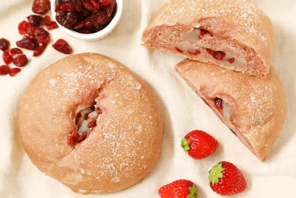 | 特徴(ブール) | 加水率90%以上の高加水生地、いちご100%パウダー配合、白あん+ドライクランベリーで苺大福のような味わい |