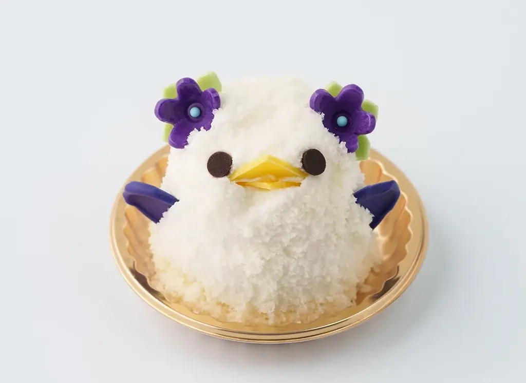 白いスポンジ粉末のクラムで被せ、ひよこ形の生スイーツとして形成。頭部にチョコレートの花飾り(紫・ピンクいずれか)を配置。